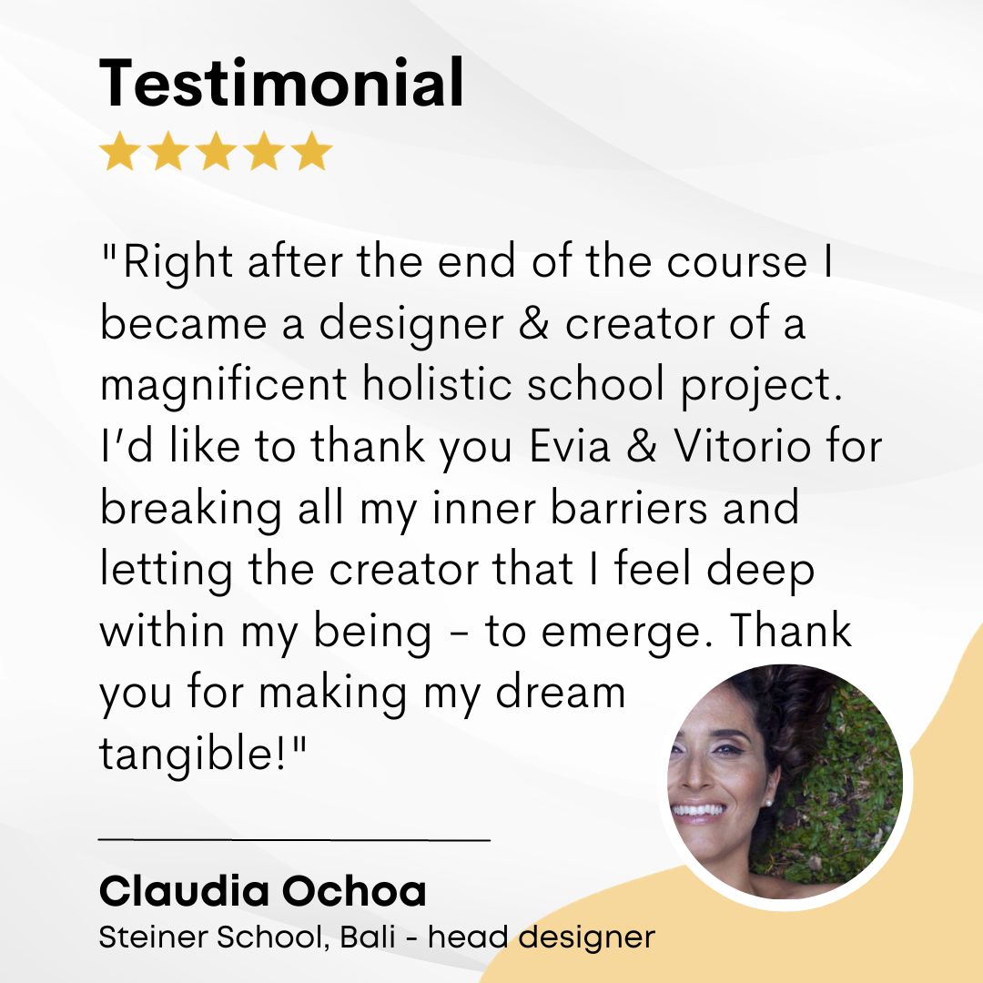 Having followed the path of art and beauty and passion for transforming spaces Evia first became an innovative interior designer, creating concepts for hospitality business, blending nature, luxury and eco-responsible principles. Operating at all levels of a project from concept to management , Evia accumulated skills, knowledge and recognition in the material world till the moment when an unexpected deep soul calling brought her to make a life changing choice to leave the successful and established career in South of France and move to Bali where her children could receive a more magical and heart centered schooling and life experience.